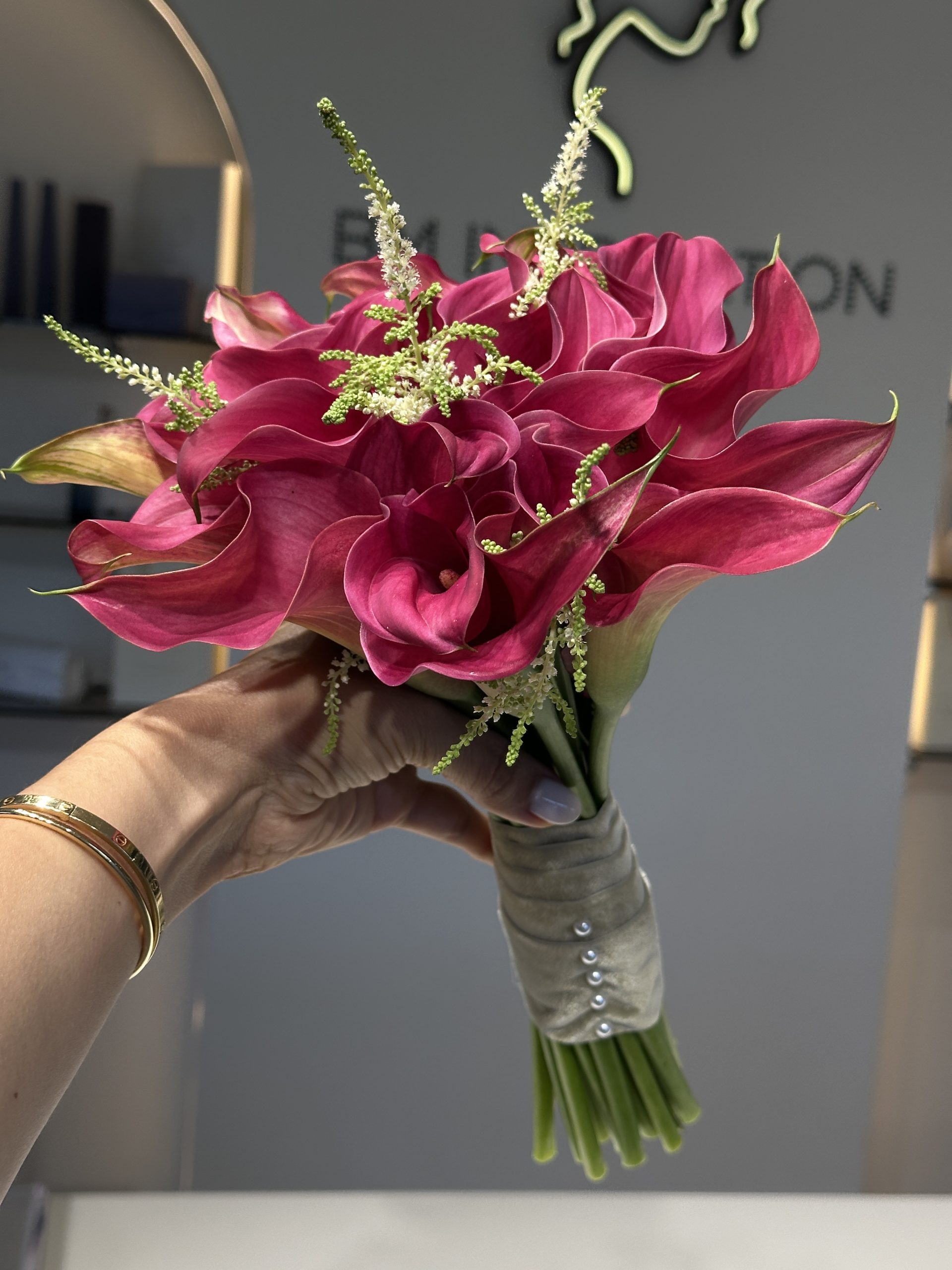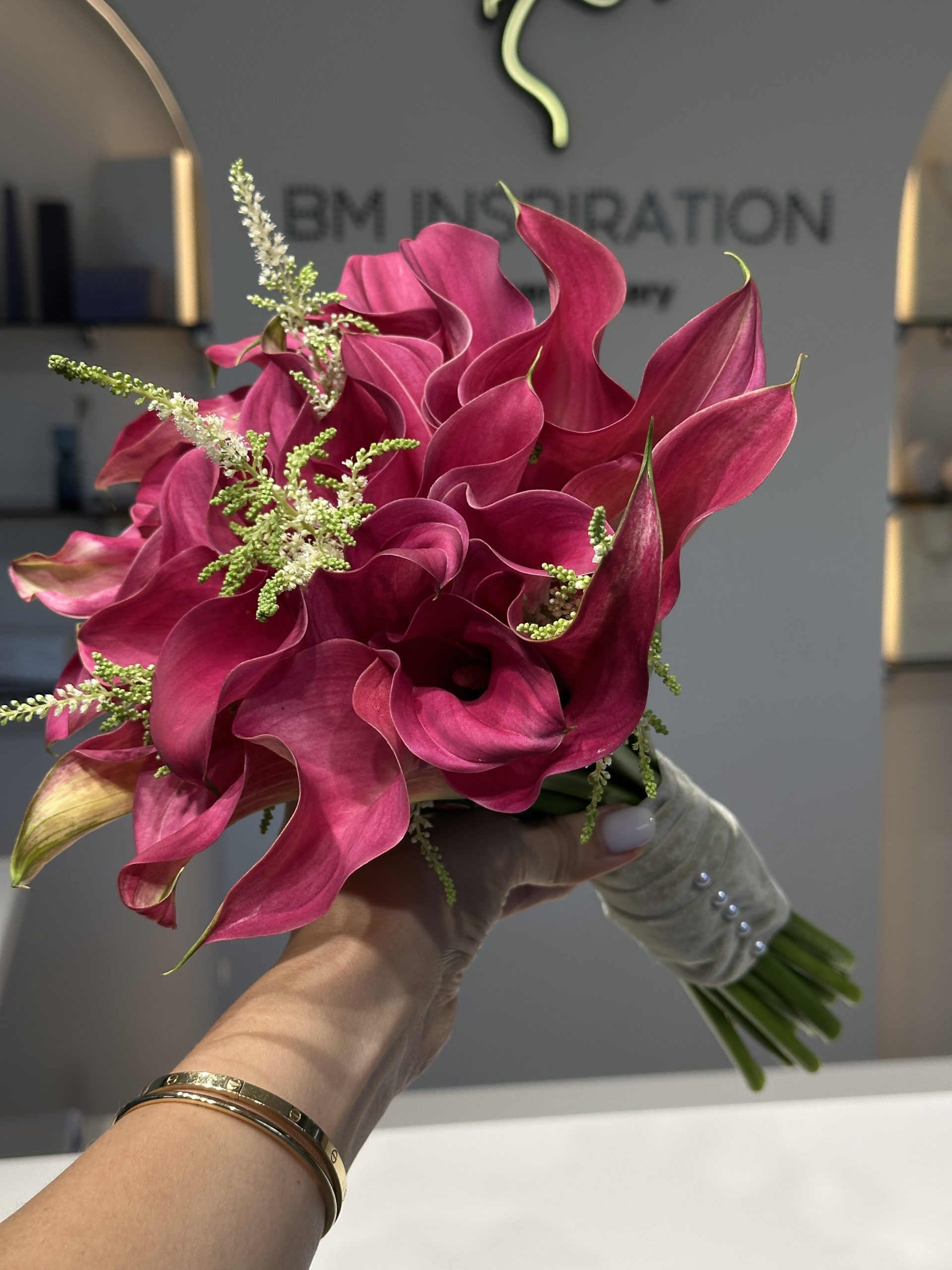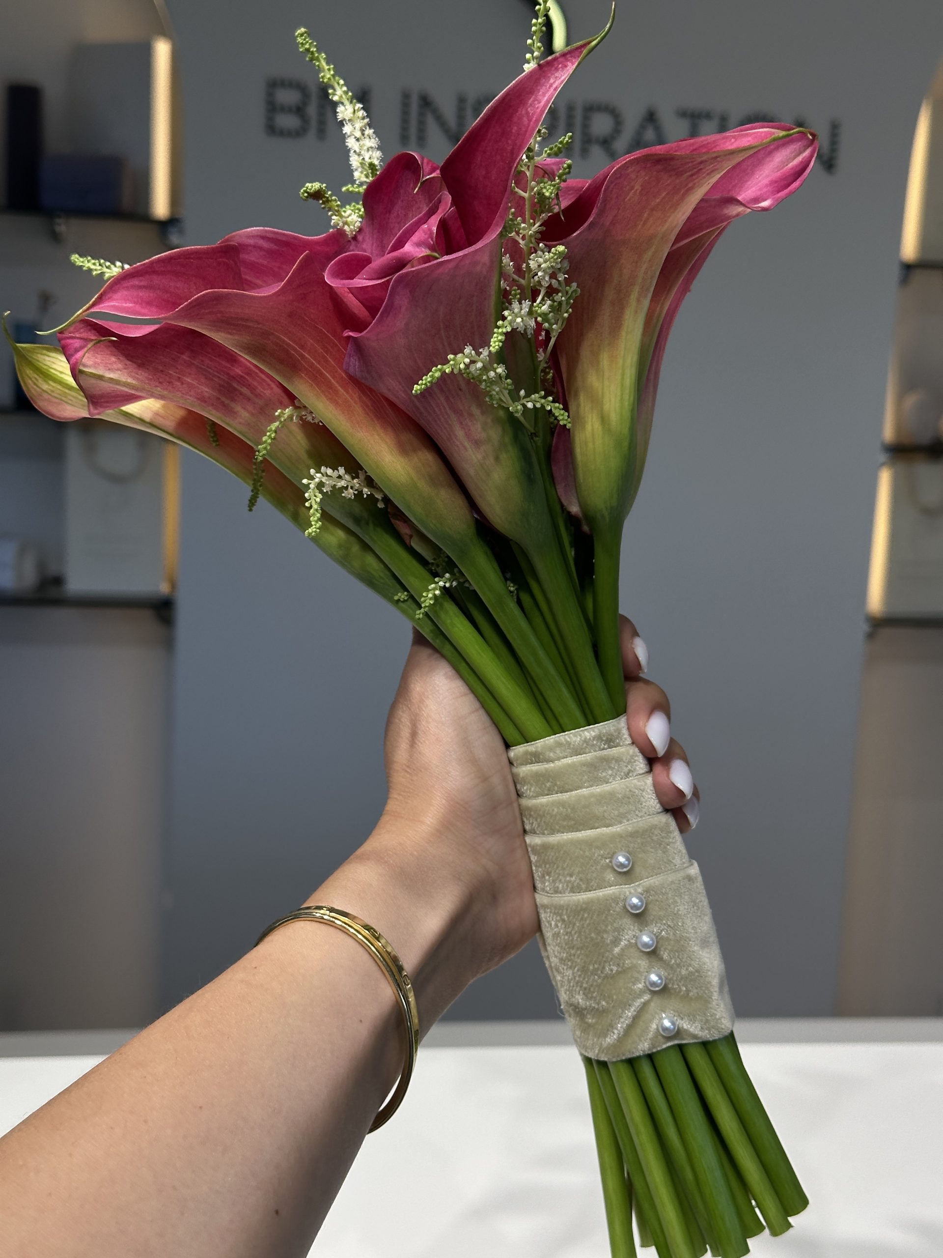 Buchet de mireasă din Calla premium, de origine Olanda, astibla și alte accente florale, stilizat cu fundă și perle, care oferă o notă suplimentară de stil și rafinament, semnate BM INSPIRATION Flower Gallery.