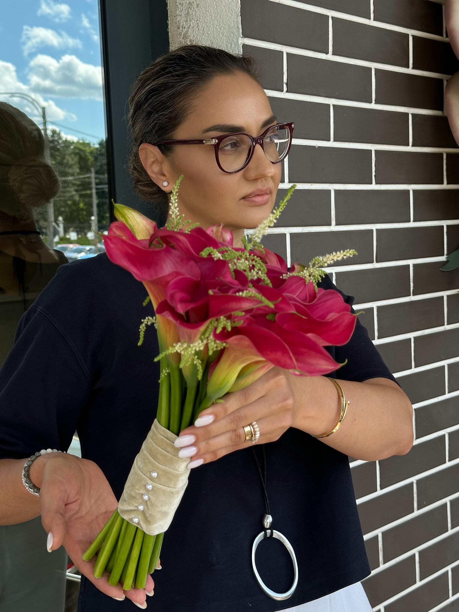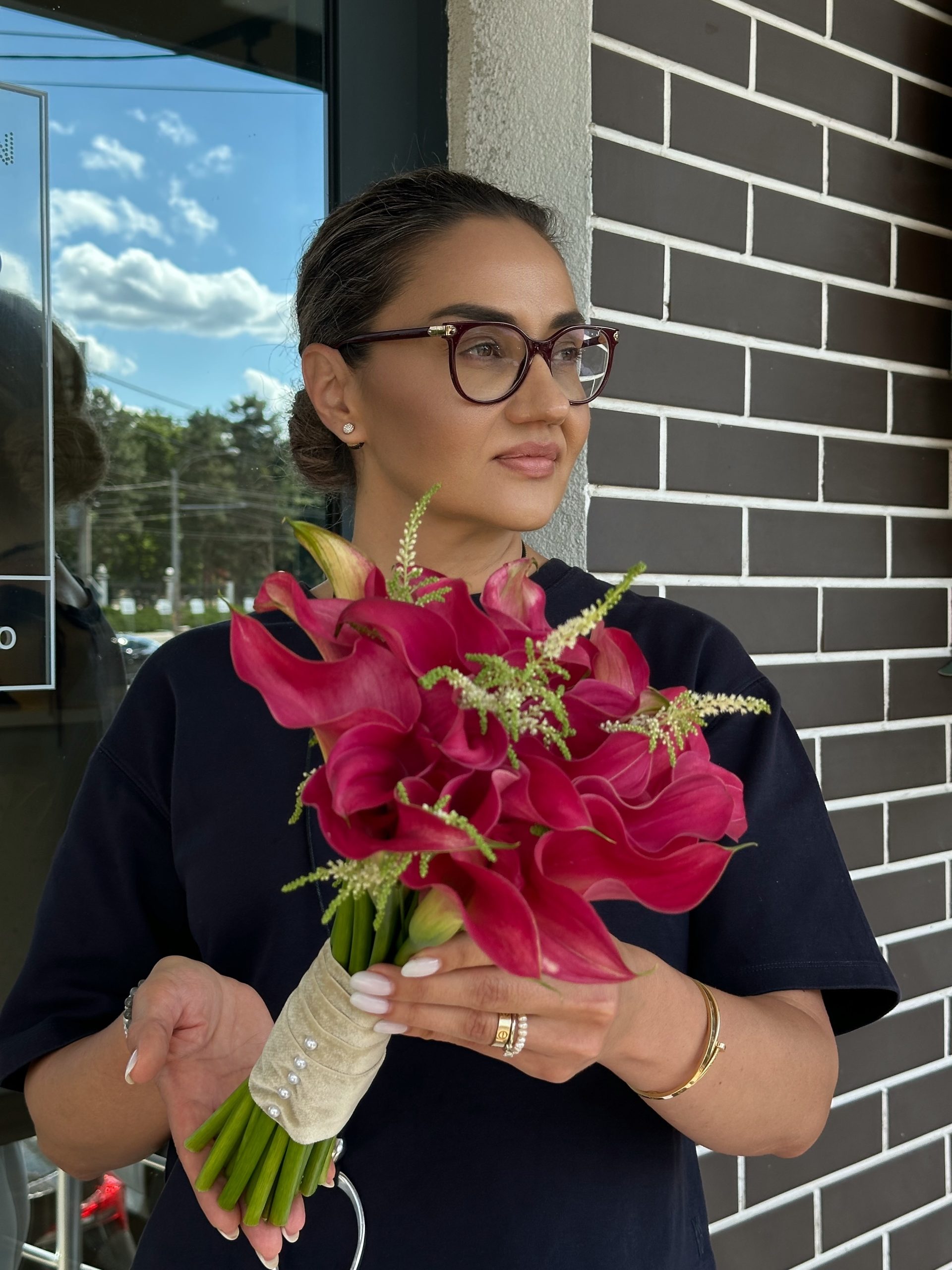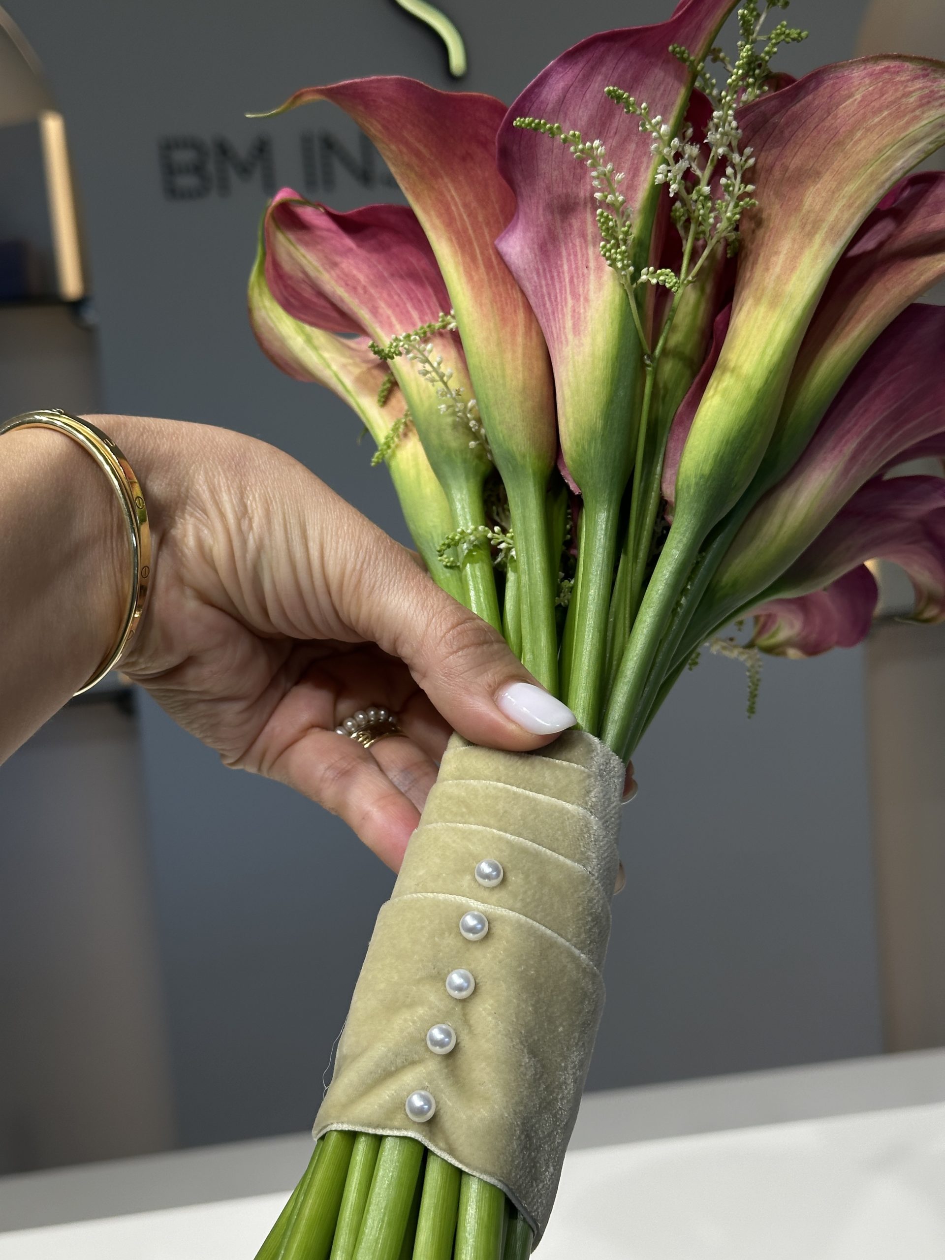 Buchet de mireasă din Calla premium, de origine Olanda, astibla și alte accente florale, stilizat cu fundă și perle, care oferă o notă suplimentară de stil și rafinament, semnate BM INSPIRATION Flower Gallery.