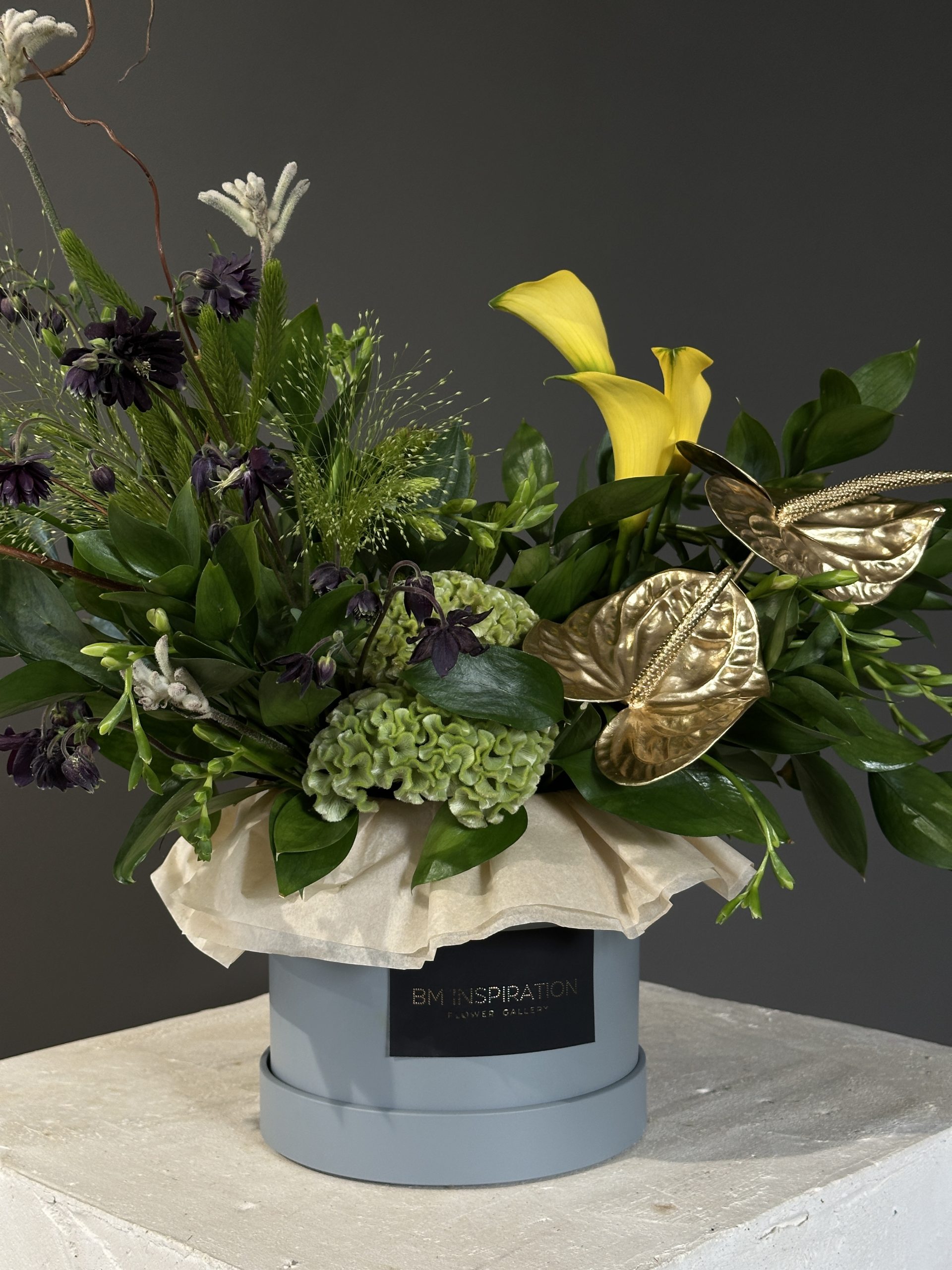 Aranjament floral în cutie, creat dintr-un mix de flori premium precum cale , celosia, anthurium stabilizat, vopsit în nuanță aurie, ruscus și alte accente florale.
