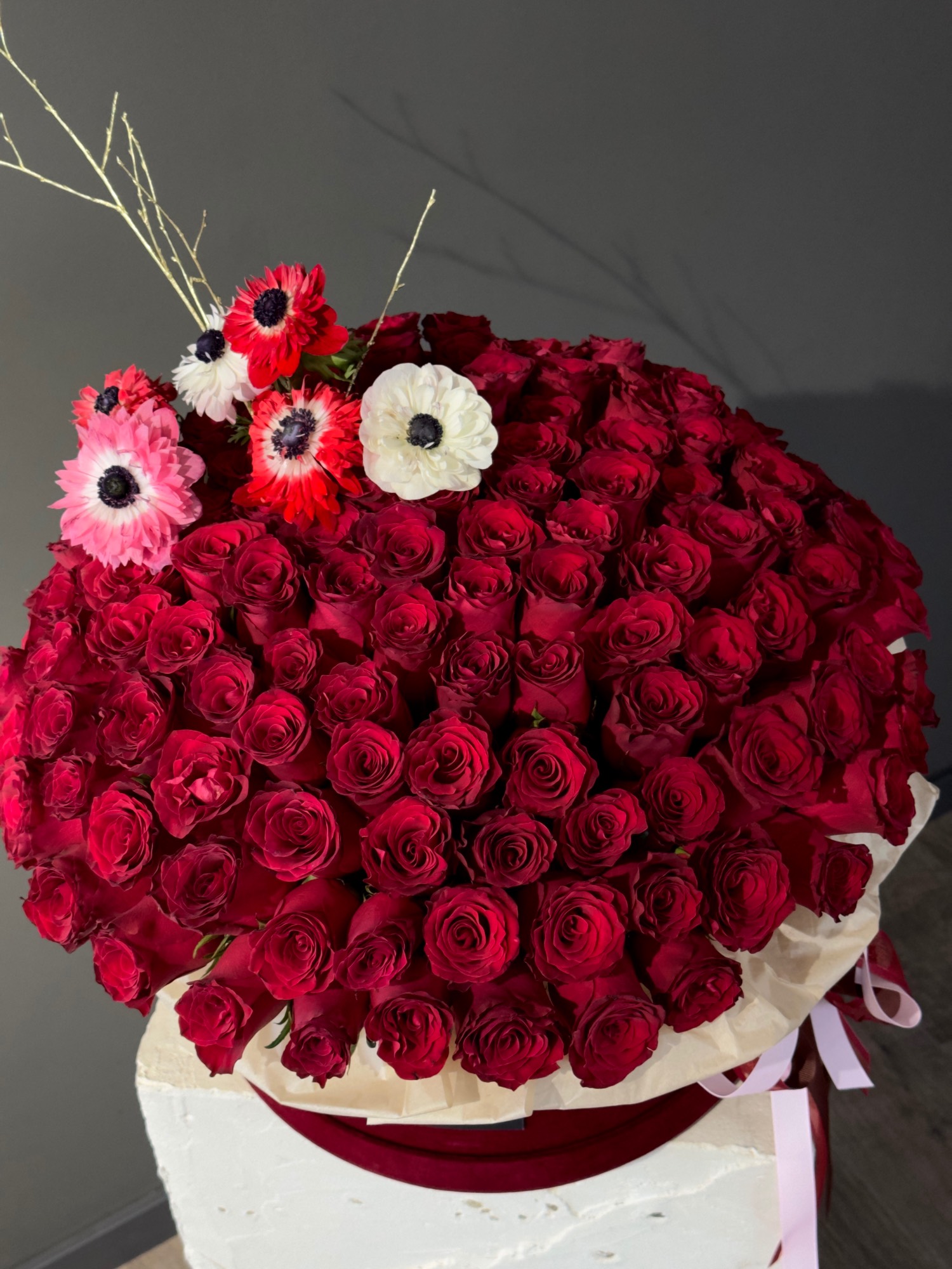 Un aranjament spectaculos, plin de eleganță și emoție, într-o cutie rotundă de velur de lux. Lucrarea este realizată din 151 de trandafiri roșii medii, completați de accente rafinate de anemone, așezate pe bază de oasis pentru prospețime îndelungată. Cutia mare, simetrică și atent finisată, oferă un efect vizual impresionant. Disponibilă și în variante cu trandafiri albi, roz sau combinații personalizate. Ideală pentru ocazii speciale în care vrei să lași o impresie de neuitat.