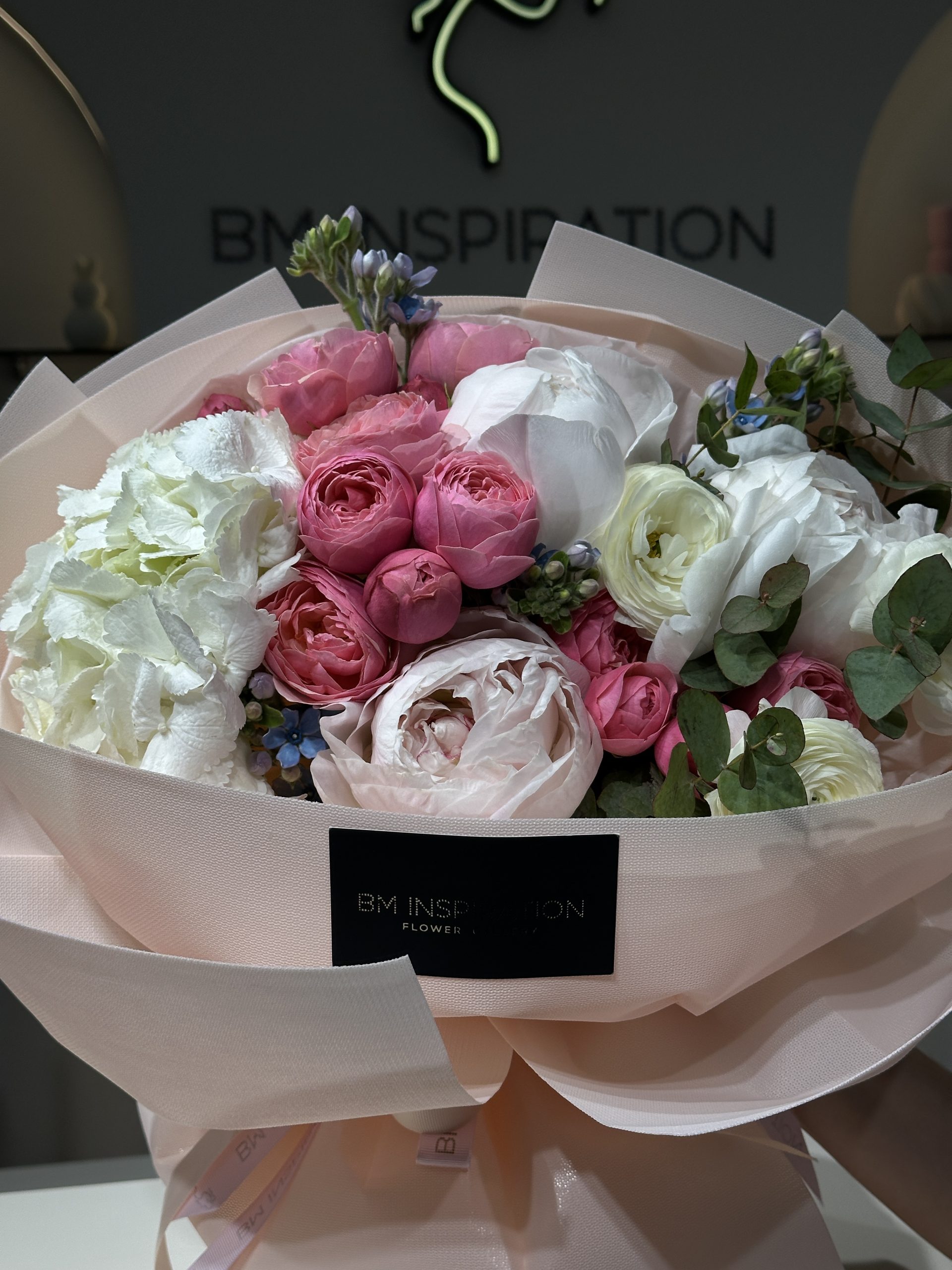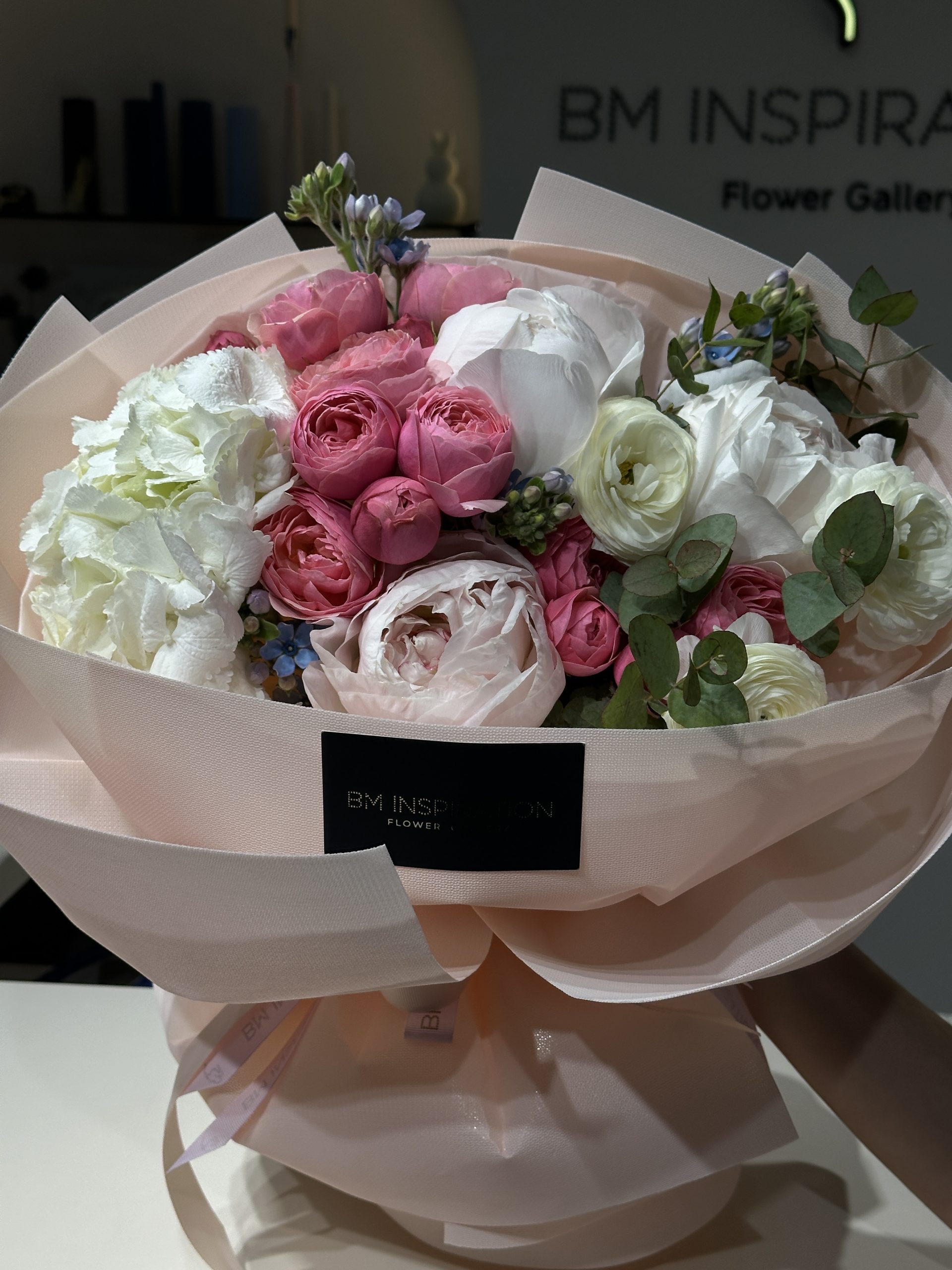 Buchet cu ambalaj, creat în spirală, dintr-un mix de flori premium precum, 1 hortensie, crenguțe de trandafirași Silva Pink, pioni, eucalipt, oxipethalum și alte accente florale.