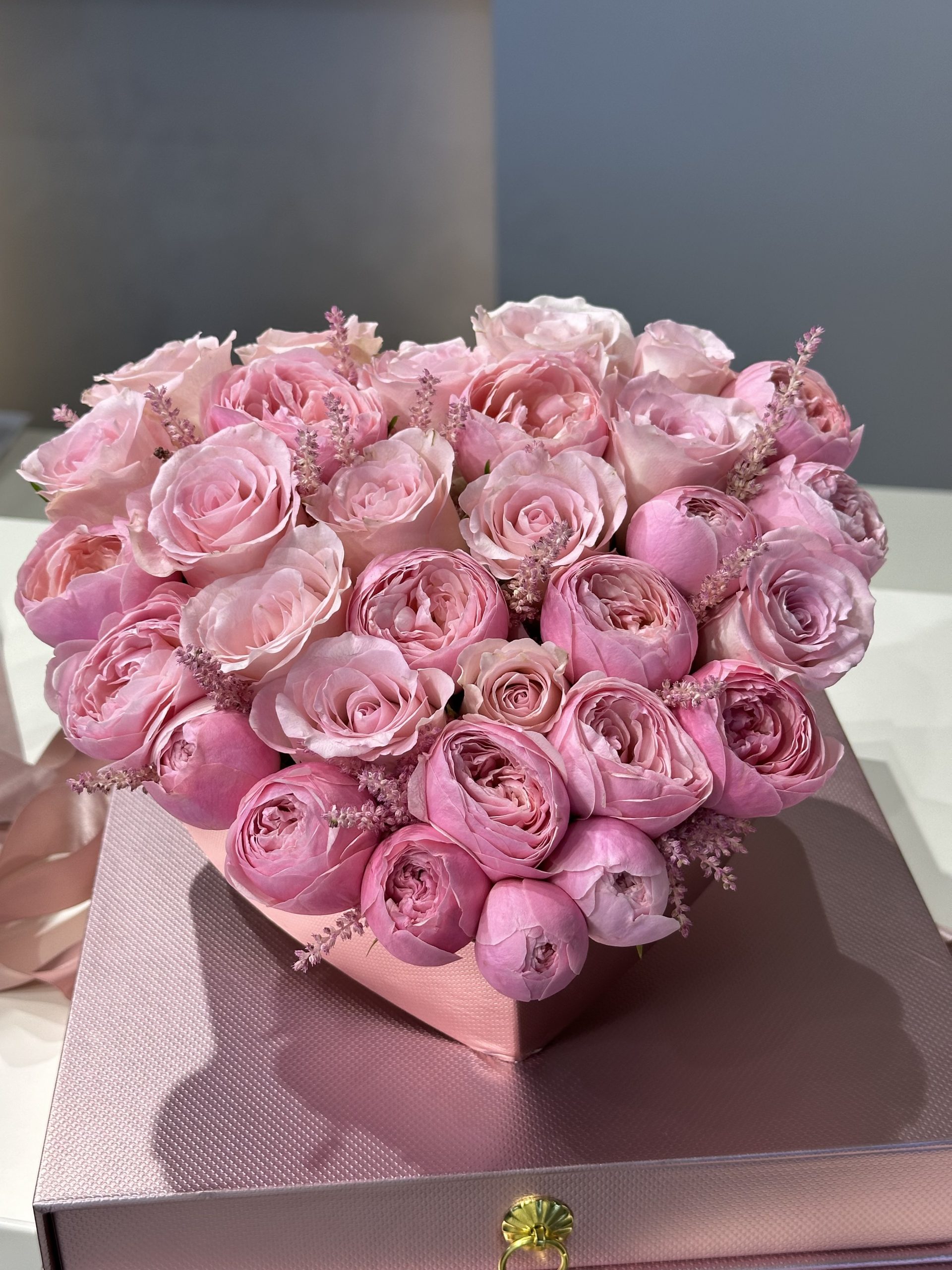 O cutie elegantă și plină de farmec, creată pentru a surprinde prin combinația de trandafiri Silva Pink și accente delicate de astilbe. Ideală pentru a crea un cadou memorabil și sofisticat.